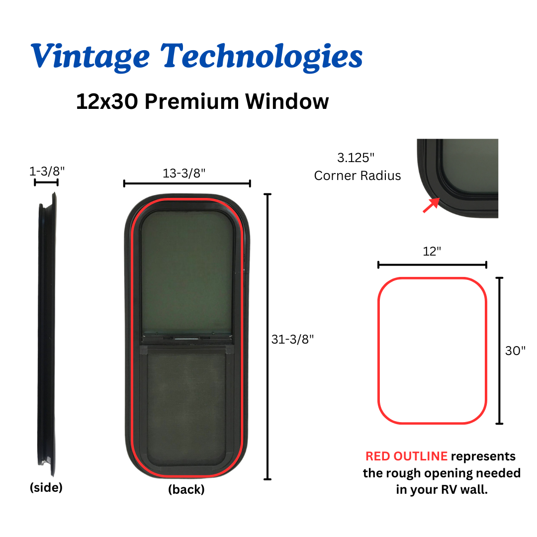 Premium RV Window 12″ Wide x 30″ Tall with Trim