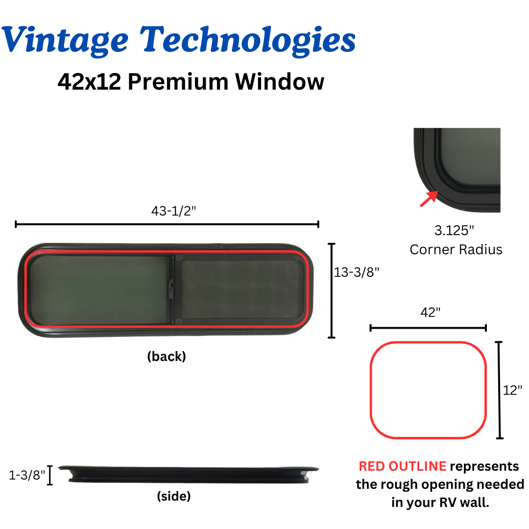 Premium RV Window 42″ Wide x 12″ Tall with Trim
